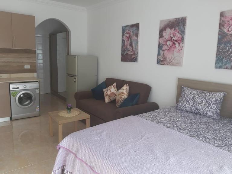 One-Bedroom Apartment. Guests can make meals in the kitchen that features a stovetop, a refrigerator, kitchenware and a microwave. The air-conditioned apartment features a flat-screen TV with satellite channels, a washing machine, a tea and coffee maker, a seating area as well as pool views. The unit has 2 beds.