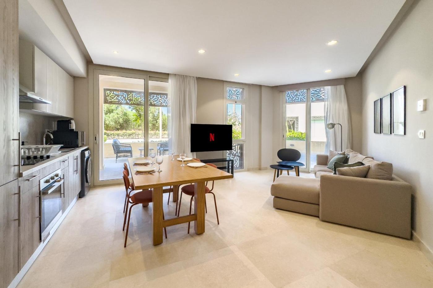 Apartment. The spacious apartment has 1 bedroom and 2 bathrooms with a bath and free toiletries. In the fully equipped kitchen, guests will find a stovetop, a refrigerator, kitchenware and an oven. This air-conditioned apartment features a dining area, a TV with cable channels a washing machine and a patio. The unit has 1 bed.