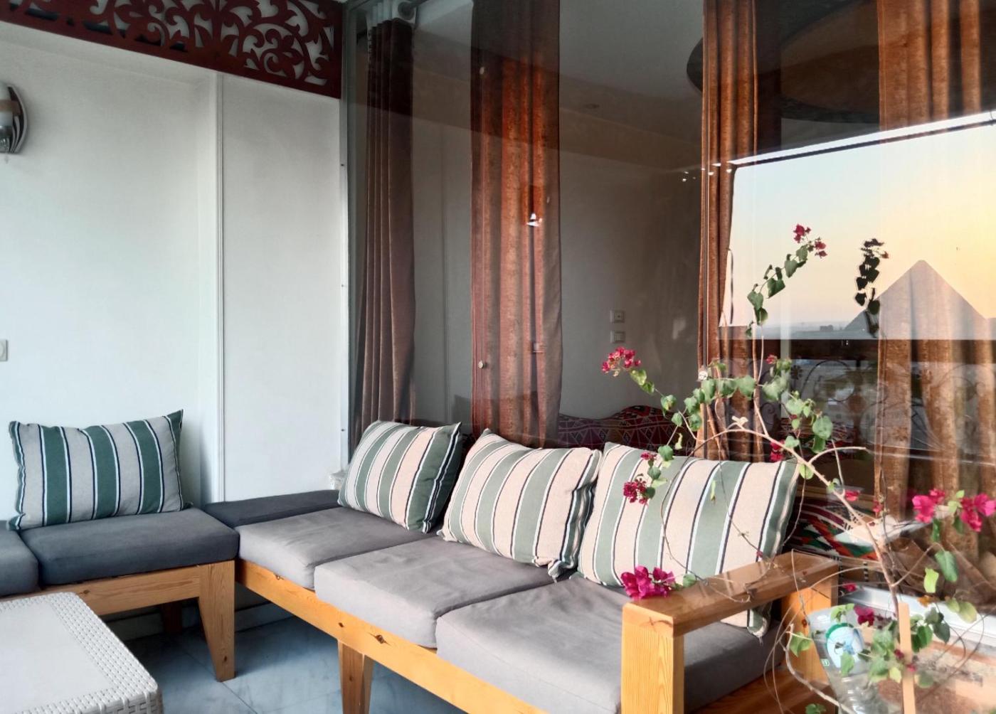 Private Apartment Pyramids View. This spacious apartment comes with 1 living room, 2 separate bedrooms and 2 bathrooms with a shower and free toiletries. Guests will find a stovetop, a refrigerator, kitchenware and a microwave in the fully equipped kitchen. The apartment also includes a barbecue. The air-conditioned apartment features a flat-screen TV with satellite channels, a washing machine, a private entrance, soundproof walls as well as city views. The unit has 3 beds. ;